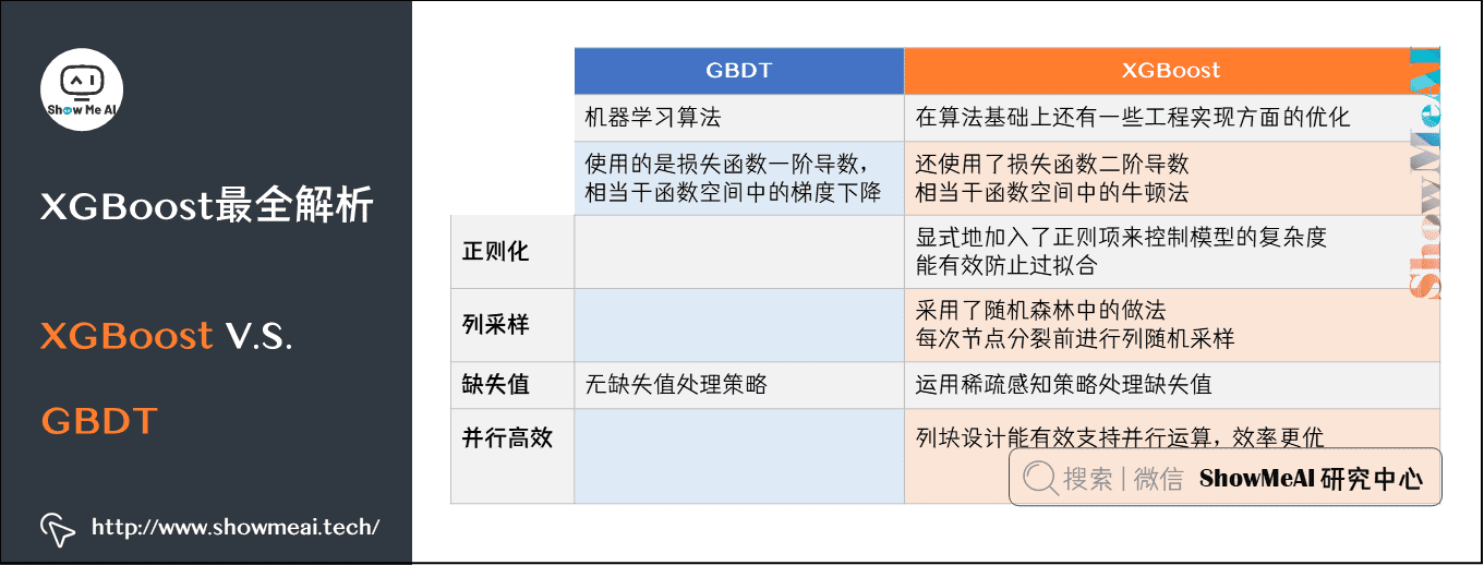 我们对之前讲解过的GBDT(参考ShowMeAI文章【GBDT算法详解】)和这里的XGBoost做一个对比总结: