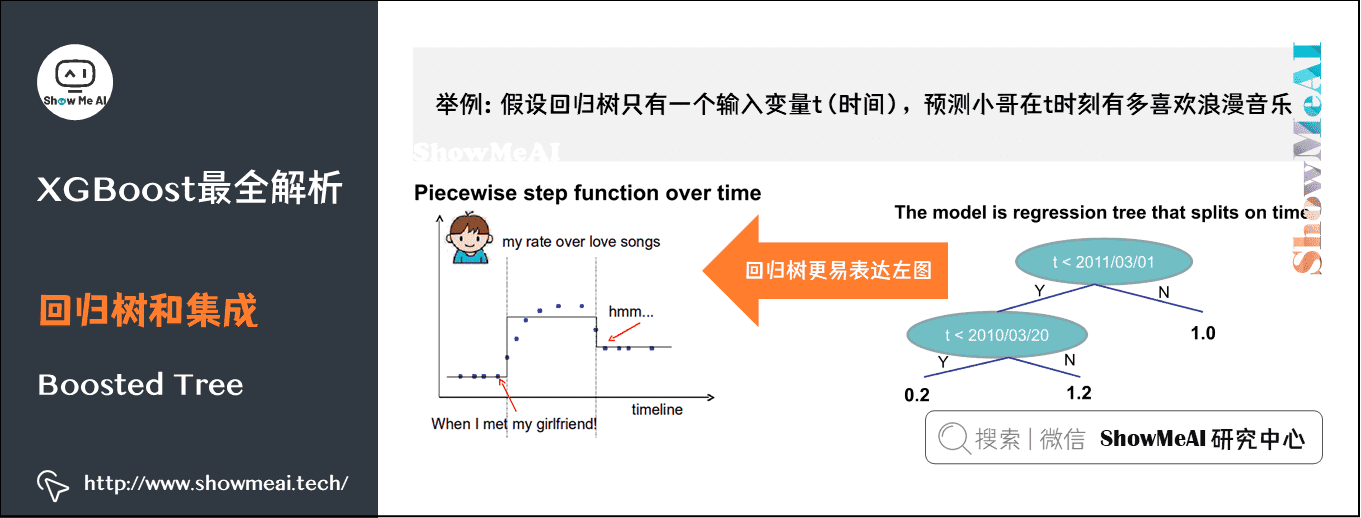 从上左图可以看到,这位小哥在单身的时候,对浪漫音乐的喜欢程度很低;但是当他遇到了女朋友,随着体内荷尔蒙的分布增加,他对浪漫音乐的喜欢程度增加了;但是有一天分手了,他对浪漫音乐的喜欢程度又变低了。当然,我们也可以发现,上右图的回归树很容易能表达上左图。
