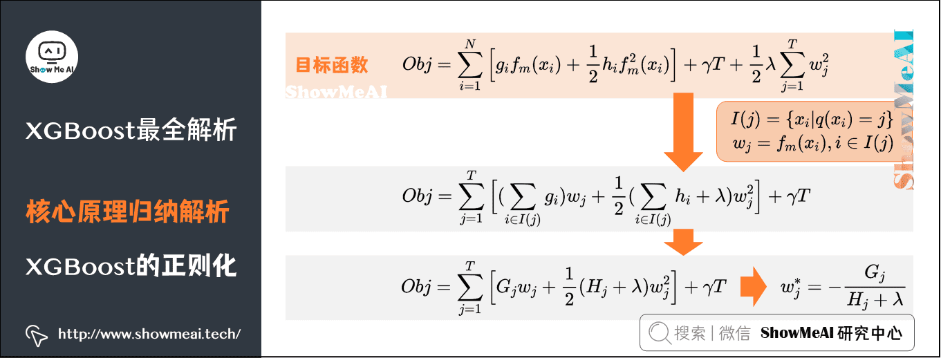 O b j = ∑ i = 1 N [ g i f m ( x i ) + 1 2 h i f m 2 ( x i ) ] + γ T + 1 2 λ ∑ j = 1 T w j 2 Obj = sum_{i=1}^N Big[g_i f_m(x_i)+frac{1}{2} h_i f_m^2(x_i)Big]+gamma T + frac{1}{2} lambda sum_{j=1}^T w_j^2 Obj=i=1∑N[gifm(xi)+21hifm2(xi)]+γT+21λj=1∑Twj2