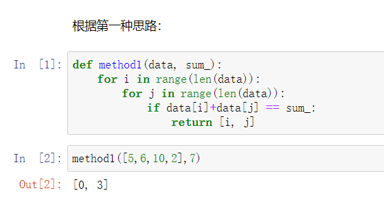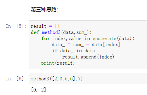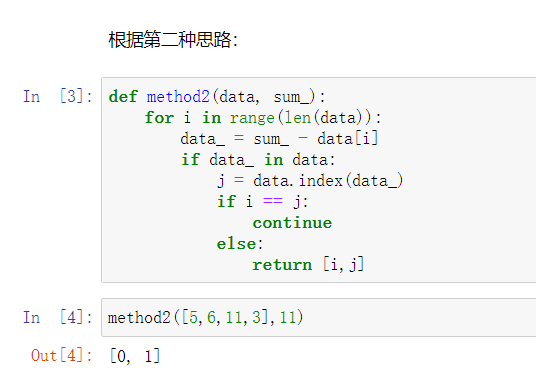 (2)使用减法,将指定数字减去数组中的任一元素,判断所得的差是否在数组中,通过该元素的值来得到该元素的索引。只有一重循环,效率有所提高,但难点在于通过元素值来得到元素索引。