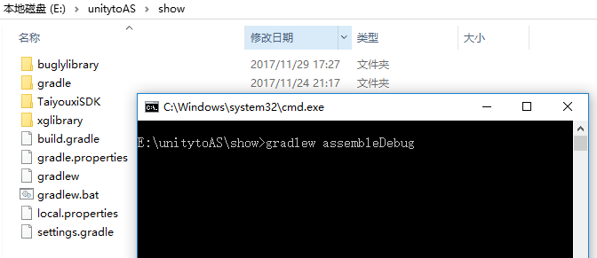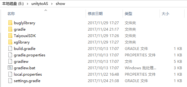 (2)把两个Module:buglylibrary和xglibrary拷进来,把gradle(这里用的3.3)、build.gradle、gradle.properties、gradlew、gradlew.bat、local.properties、settings.gradle文件拷进来。如图:(当你用Android Studio打开TaiyouxiSDK后会自动出现这些文件,这里用命令行出包,没有使用Android Studio)