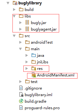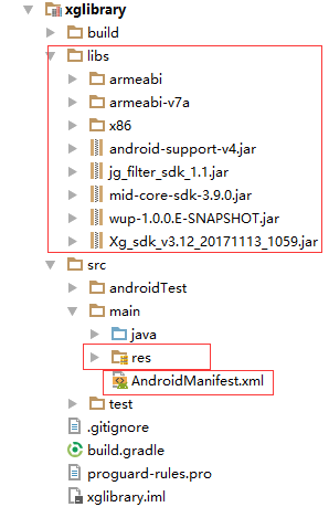 这里我已经做好了buglylibrary和xglibrary,其实就是新建一个Module,把对应的资源文件拷进去,一般是有libs文件夹、res文件夹和Androidmanifest.xml文件。Module里的资源如下: