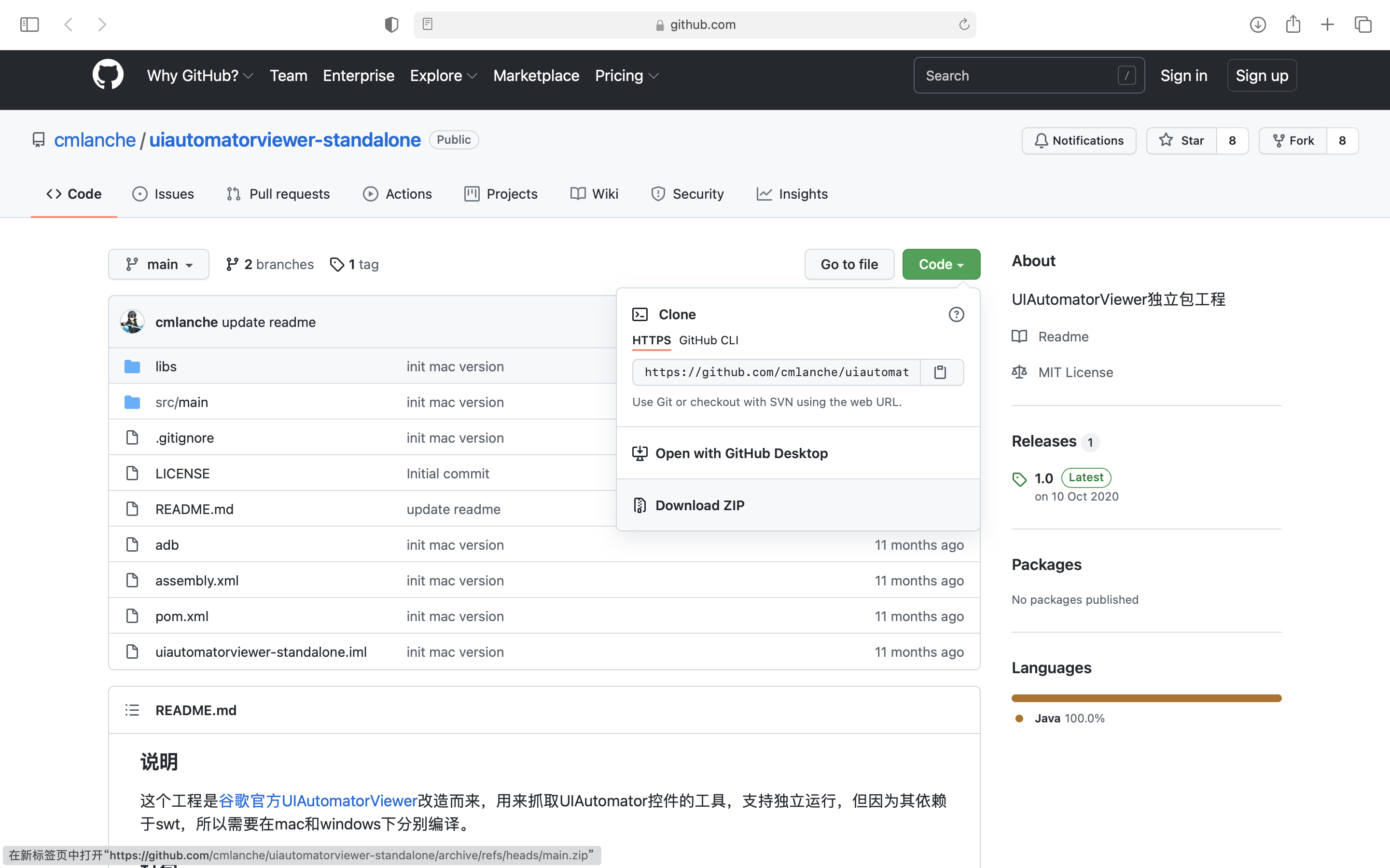 1.前往GitHub:GitHub - cmlanche/uiautomatorviewer-standalone: UIAutomatorViewer独立包工程