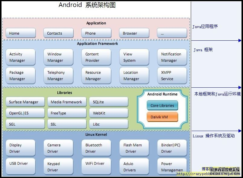 第二层是我们框架层,在这个层次中包括了10最主要的部分。包括我们的活动管理层,窗口管理器,内容提供者,试图子系统,通知管理器,包管理器,电话管理器,资源管理器,位置管理器,XMPP服务。这10个最重要的组成部分共同为我们的API提供相应的管理机制