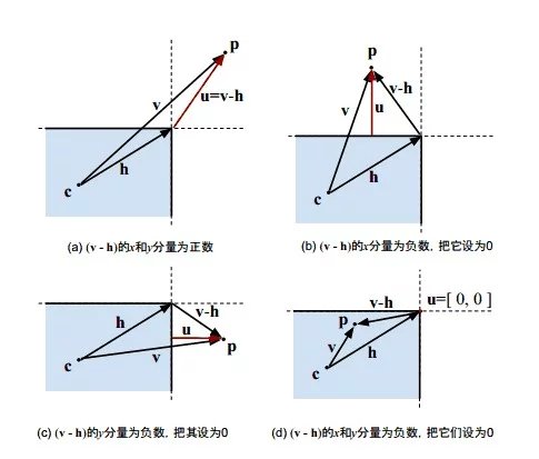 2. 然后,把v减去h,负数的分量设置为0,就得到圆心与矩形最短距离的矢量u。下图展示了四种情况,红色的u是结果。