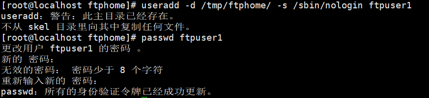 # useradd -d /tmp/ftphome/ -s /sbin/nologin ftpuser1