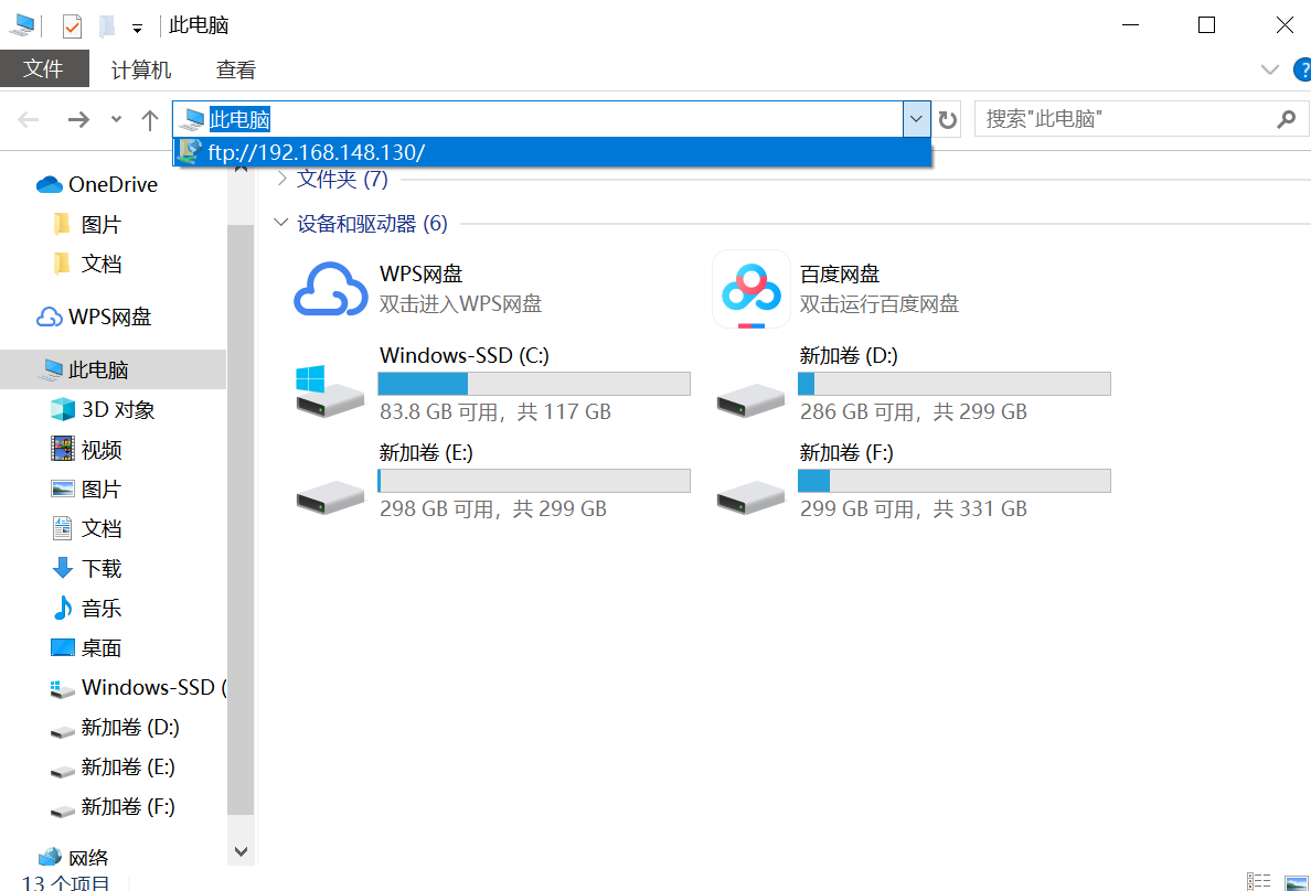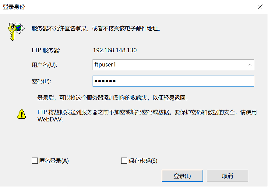 5、测试:在windows中打开我的电脑,在地址栏输入ftp://192.168.148.130,会提示出入用户名密码,即可登录访问