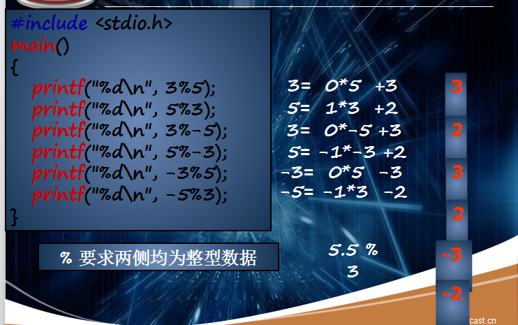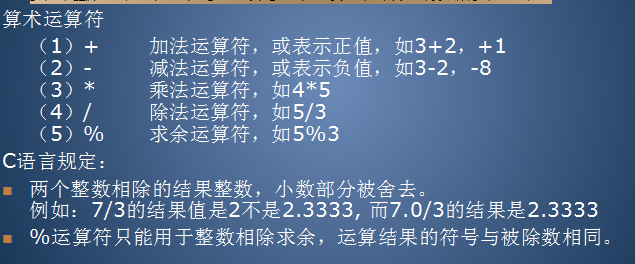 两个整数相除的结果整数,小数部分被舍去。%运算符只能用于整数相除求余,运算结果的符号与被除数相同。
