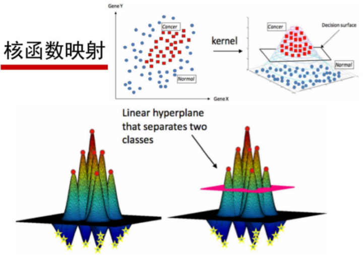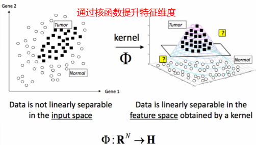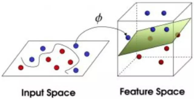 在解决线性不可分问题时,它可以通过引入核函数,巧妙地解决了在高维空间中的内积运算,从而很好地解决了非线性分类问题。如下图所示,通过核函数的引入,将线性不可分的数据映射到一个高纬的特征空间内,使得数据在特征空间内是可分的。如下图所示: