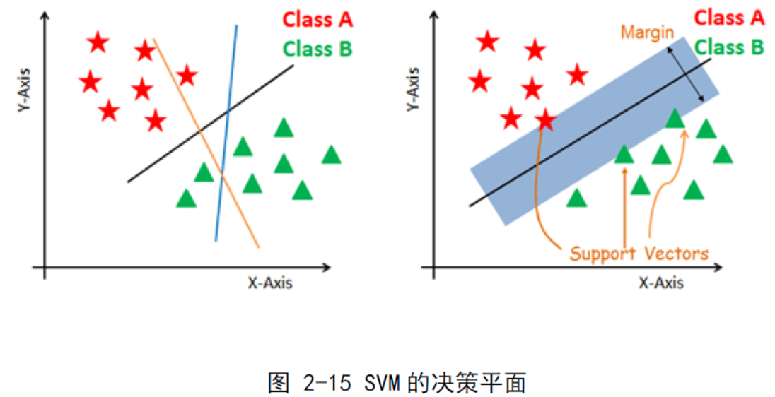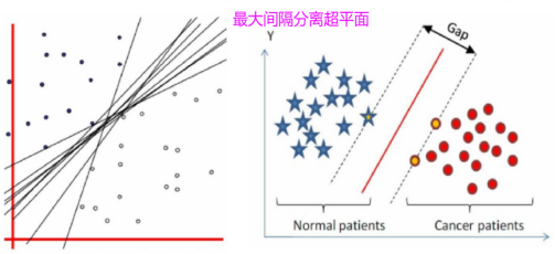 在分类问题中,很多时候有多个解,如下图左边所示,在理想的线性可分的情况下其决策平面会有多个。而SVM的基本模型是,在特征空间上找到最佳的分离超平面使得训练集上正负样本间隔最大,SVM算法计算出来的分界会保留对类别最大的间距,即有足够的余量,如下图右边所示。