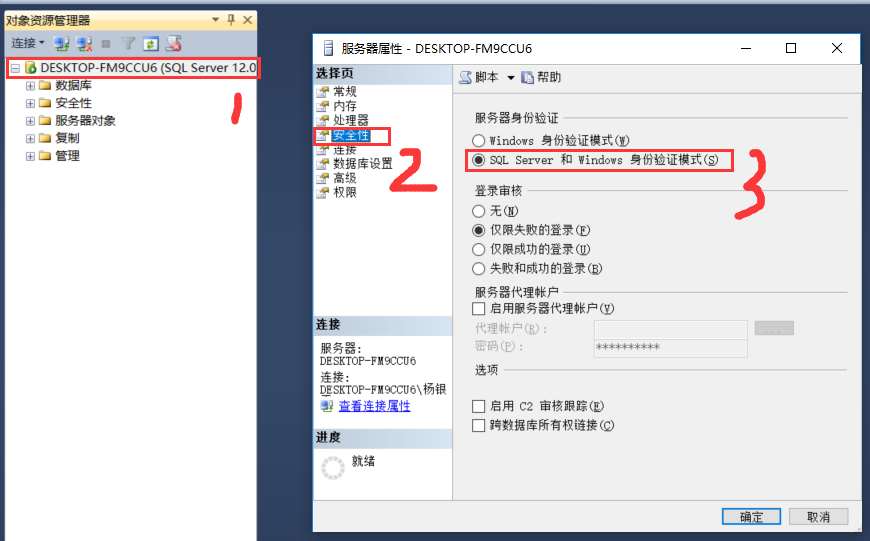 3.点击连接会弹出对象资源管理器,打开如图步骤:服务器验证身份为SQL Server和Windows身份验证模式(S)。