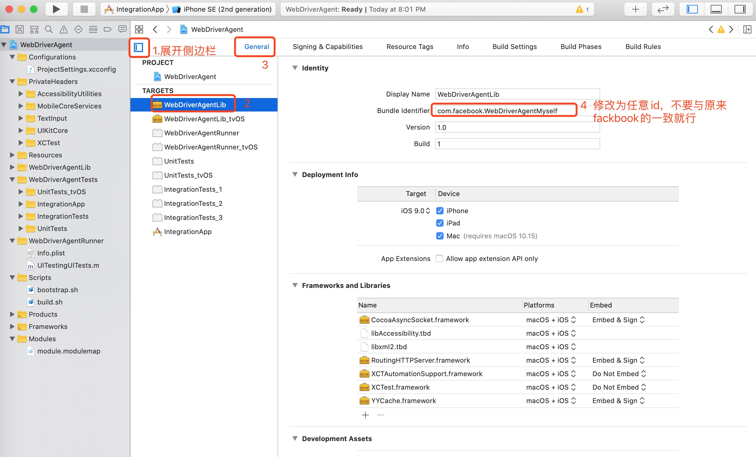 在/Users/qiaoersun/Downloads/WebDriverAgent-master目录下面以xcode方式打开WebDriverAgent.xcodeproj