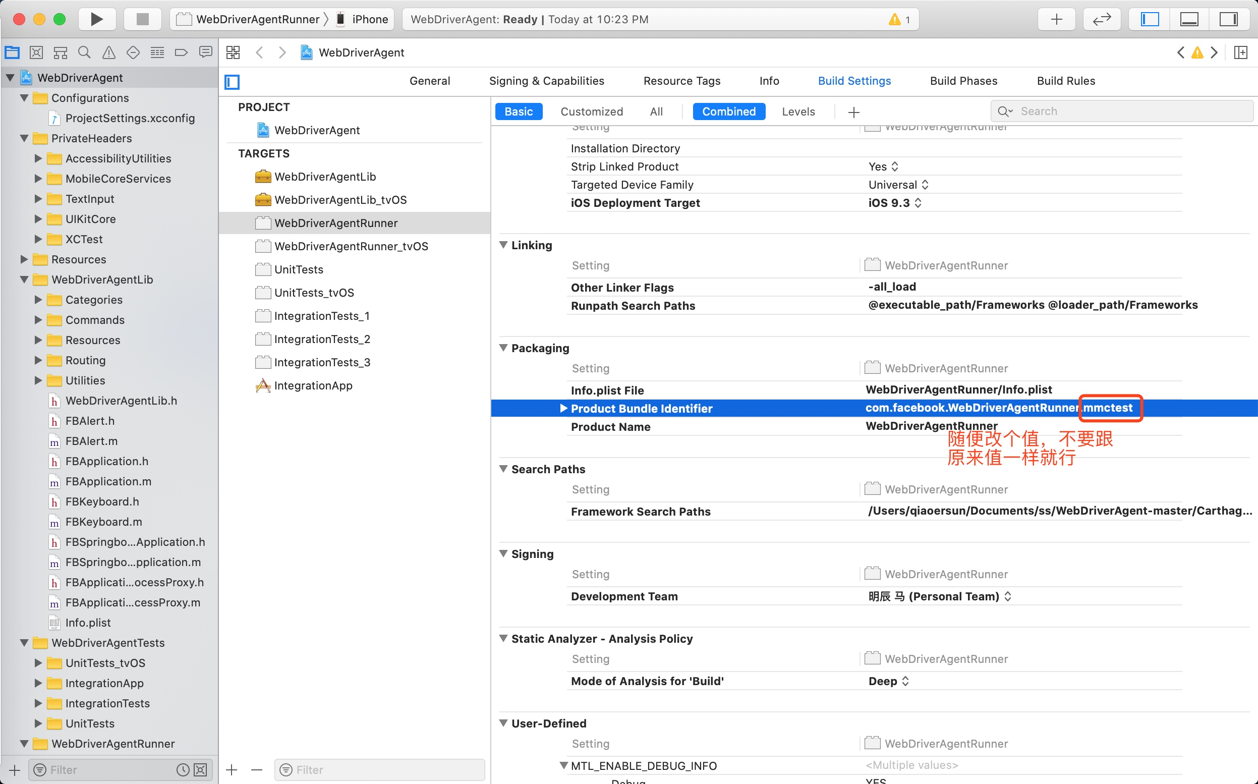上面的报错,解决:请进入WebDriverAgentRunner -> Build Settings设置中,找到Packaging中的选项,将其内容修改为唯一识别的字符串就不报错了,如下图所示: