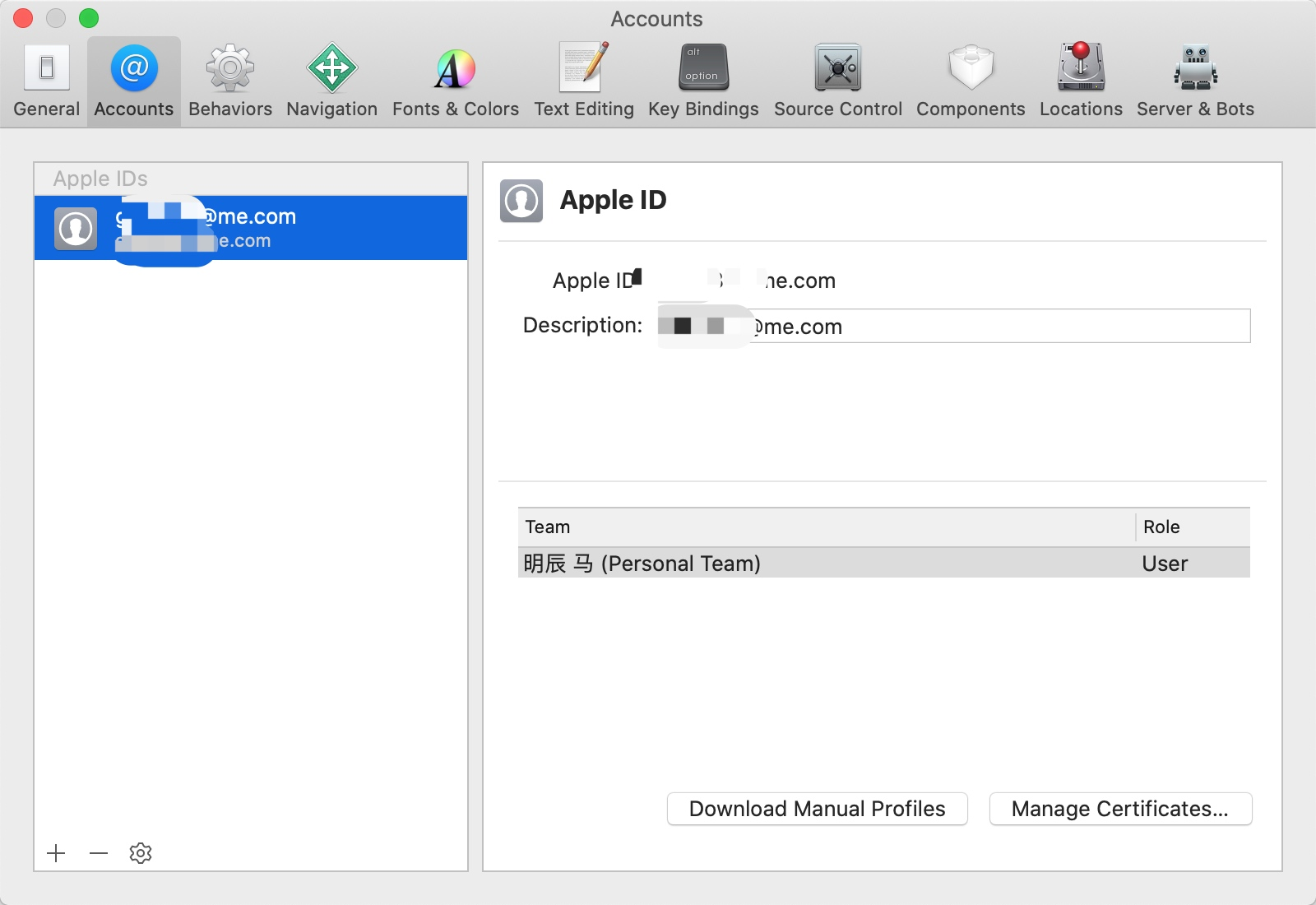 添加之后的账户可以在 Xcode->perferences->account,出现下面的界面,能看到自己的账号信息