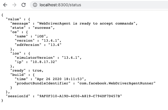 (2)地址后面添加/status可以查看当前设备的状态,获取与wda通信session id