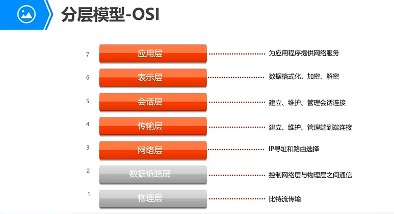 举个例子,A通过QQ向B发送信息,首先根据端口号来确认它的应用程序是什么,然后对关键信息进行加密解密,经过会话层判断要发送的对象,进入传输层建立连接(可以选择可靠的TCP,也可以选择快速的UDP,QQ通常是UDP),再经过IP寻址和路由选择进行传输。最后通过数据链路层,传输介质,转变成比特流。