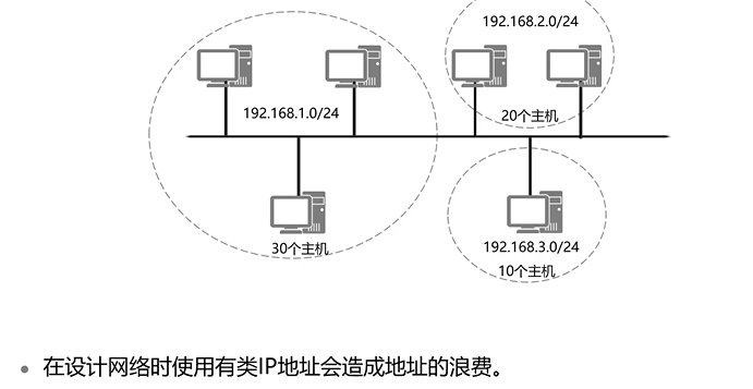 一个网段可以使用的主机数位254个,每个网段分别只需要30个、20个、10个主机,会造成浪费。