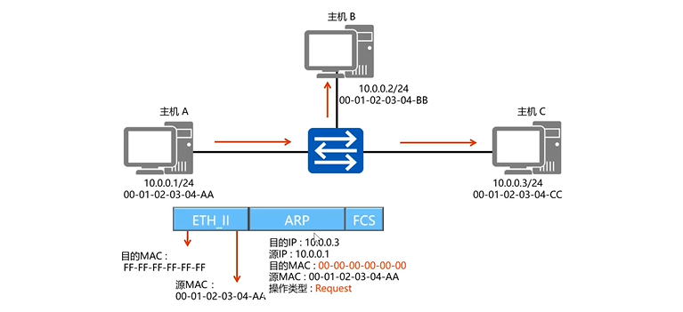 主机A发送一个数据包给主机C之前,首先要获取主机C的MAC地址。通过arp -a获取缓存表,查看是否已经有主机C的MAC地址,若没有需要发送ARP请求报文,通过IP地址获取MAC地址。