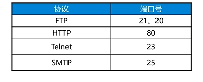 端口号用来区分不同的网络服务。固定端口号为:0 - 1023.均为一些知名端口。动态端口号为 1024 - 65535.