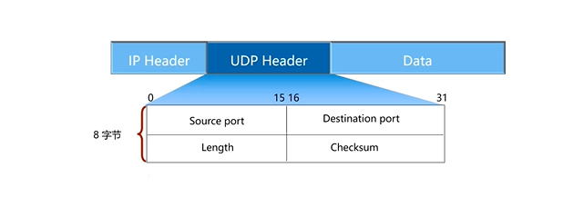 UDP头部仅占8字节,传输数据时没有确认机制。