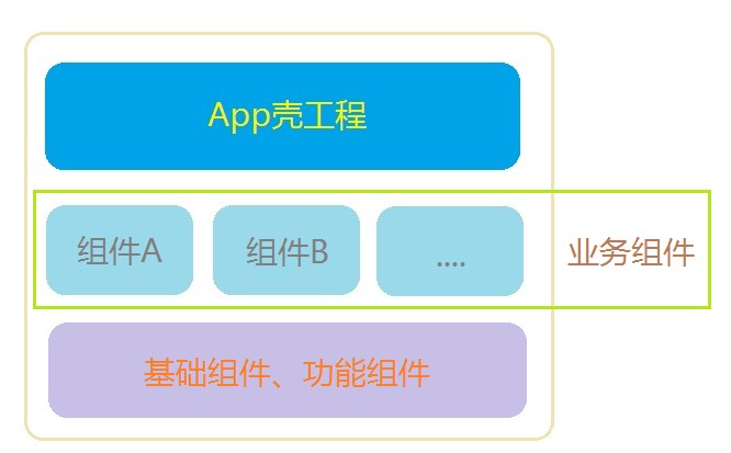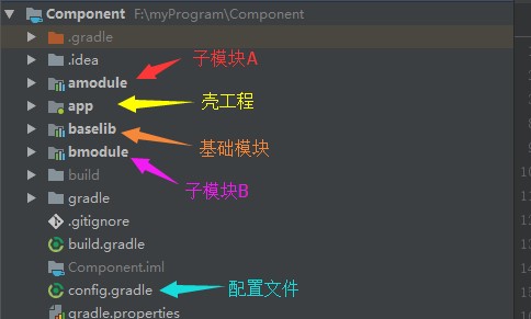 组件化就是将App分成多个Module,每个Module以library的形式存在于项目中,并存在一个壳工程依赖这些Module。如图所示: