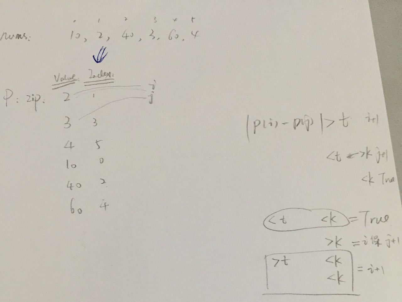 While on the other hand, if the value difference <= t, but the index difference > k, we still have to keep the current P[i] and move P[j] until meets the above scenario or the end of the array.