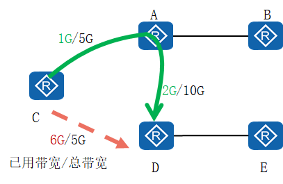 网络基于带宽计算转发路径。路由器C到路由器D的链路为最短转发路径。C-D的业务流量开始超过带宽出现丢包现象。虽然其他链路空闲,但是算法依然选择最短路径转发。如果可以全局考虑,此时最优的流量转发路径为C-A-D。
