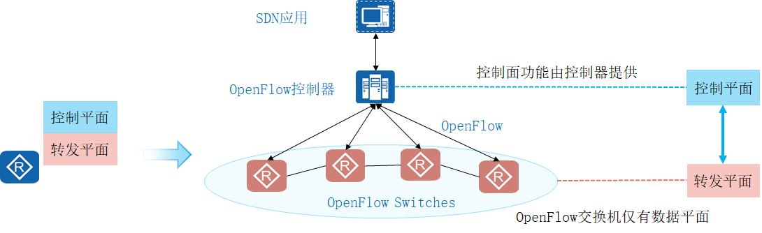 在传统的网络架构里面引入了OpenFlow的概念,在转发平面搭建多个OpenFlow交换机,这些OpenFlow交换机由OpenFlow控制器来控制。
