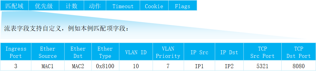匹配域:匹配到某种特征的流量才能进行相应的转发,比传统的数据转发更加灵活,可选项更多;