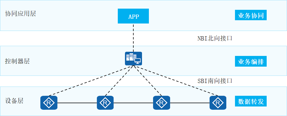 • 协同应用层:主要完成用户意图的各种上层应用,典型的协同层应用包括 OSS 、 OpenStack 等。 OSS 可以负责整网的业务协同, OpenStack 云平台一般用于数据中心负责网络、计算、存储的业务协同。还有其他的协同层应用,比如用户希望部署一个安全 APP ,这个安全 APP 不关心设备具体部署位置,只是调用了控制器的北向接口,例如 Block ( Source IP , DestIP ),然后控制器会给各网络设备下发指令。这个指令根据南向协议不同而不同。• 控制器层:控制器层的实体就是 SDN 控制器,是 SDN 网络架构下最核心的部分。控制层是 SDN 系统的大脑,其核心功能是实现网络业务编排。• 设备层:网络设备接收控制器指令,执行设备转发。• NBI 北向接口:北向接口为控制器对接协同应用层的接口,主要为 RESTful 。• SBI 南向接口:南向接口为控制器与设备交互的协议,包括 NETCONF 、 SNMP 、 OpenFlow 、 OVSDB 等。