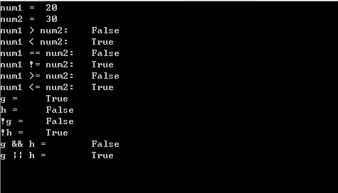 Console.WriteLine("num1 = t{0}nnum2 = t{1}nnum1 > num2:t{2}nnum1 < num2:t{3}nnum1 == num2:t{4}nnum1 != num2:t{5}nnum1 >= num2:t{6}nnum1 <= num2:t{7}", num1, num2, a, b, c, d, e, f);