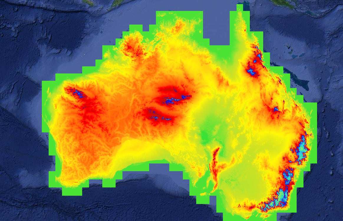 平滑数字高程模型 (DEM-S) 源自 NASA 于 2000 年 2 月获取的 SRTM 数据。DEM-S 表示地表地形(不包括植被特征),并已进行平滑处理以减少噪声并改善表面形状的表示。自适应过程在平坦区域比丘陵区域应用更多的平滑,在噪声较大的区域应用比在噪声较少的区域更多的平滑。 此 DEM-S 支持计算局部地形属性,例如坡度、坡向和曲率,这些属性由于噪声而无法可靠地从未平滑的 1 秒 DEM 导出。 有几个区域具有意外的负值:接近堪培拉(150.443044,-35.355281),值为-55,在西澳大利亚(124.84,-16.44)附近,值为-43。