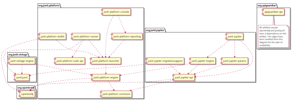 与以前的JUnit版本不同,JUnit 5由三个不同子项目的几个不同模块组成: