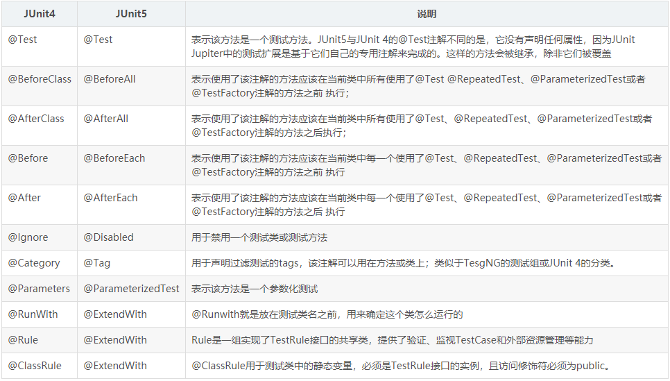 | @AfterAll | 表示使用了该注解的方法应该在当前类中所有使用了@Test、@RepeatedTest、@ParameterizedTest或者@TestFactory注解的方法之后执行一次; | @AfterAll public static void cleanup() { System.out.println("清理数据"); } | |