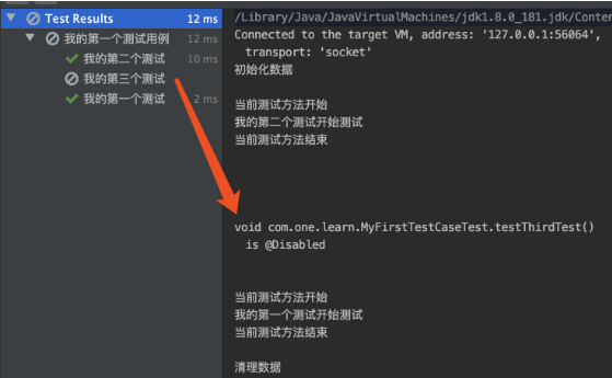 | @Disabled(禁止执行测试) | 当我们希望在运行测试类时,跳过某个测试方法,正常运行其他测试用例时,我们就可以用上 @Disabled 注解,表明该测试方法处于不可用,执行测试类的测试方法时不会被 JUnit 执行。 | @DisplayName("我的第三个测试") @Disabled @Test void testThirdTest() { System.out.println("我的第三个测试开始测试"); } | ![]() |