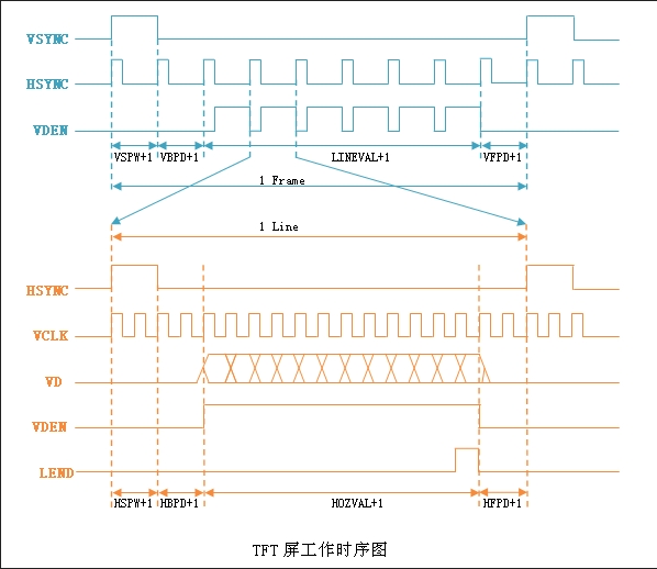 HSPW(horizontal sync pulse width):表示水平同步信号的宽度,用VCLK计算,对应驱动中的hsync_len;