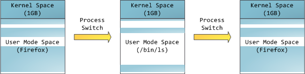 这并不意味着内核使用了那么多的物理内存,仅表示它可支配这么大的地址空间,可根据内核需要,将其映射到物理内存。内核空间在页表中拥有较高的特权级(ring 2或以下),因此只要用户态的程序试图访问这些页,就会导致一个页错误(page fault)。在Linux中,内核空间是持续存在的,并且在所有进程中都映射到同样的物理内存。内核代码和数据总是可寻址的,随时准备处理中断和系统调用。与此相反,用户模式地址空间的映射随进程切换的发生而不断变化:
