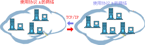 计算机网络协议同我们的语言一样,多种多样。而ARPA公司与1977年到1979年推出了一种名为ARPANET的网络协议受到了广泛的热捧,其中最主要的原因就是它推出了人尽皆知的TCP/IP标准网络协议。目前TCP/IP协议已经成为Internet中的“通用语言”,下图为不同计算机群之间利用TCP/IP进行通信的示意图。