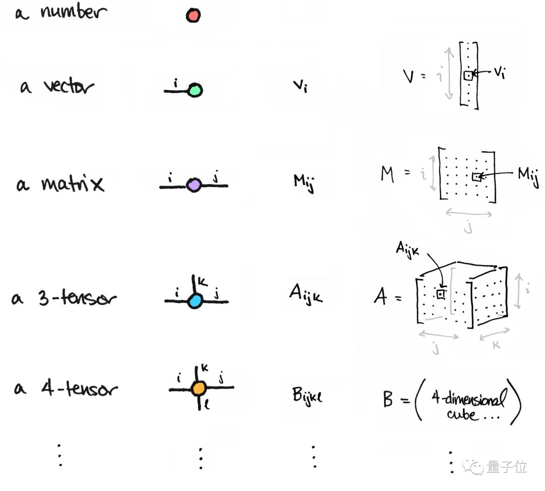 这是来自Tai-Danae手绘图。另外,标量可以看做零阶张量,向量可以看做一阶张量,矩阵是二阶张量,以此类推: