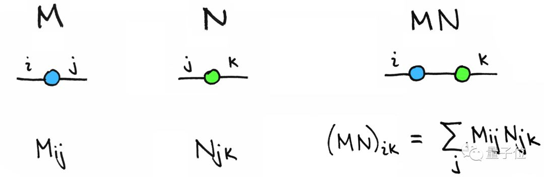 上面的矩阵乘法里,对于相同的脚标,就等于是一条线,于是两个矩阵M和N连接了起来: