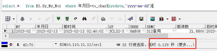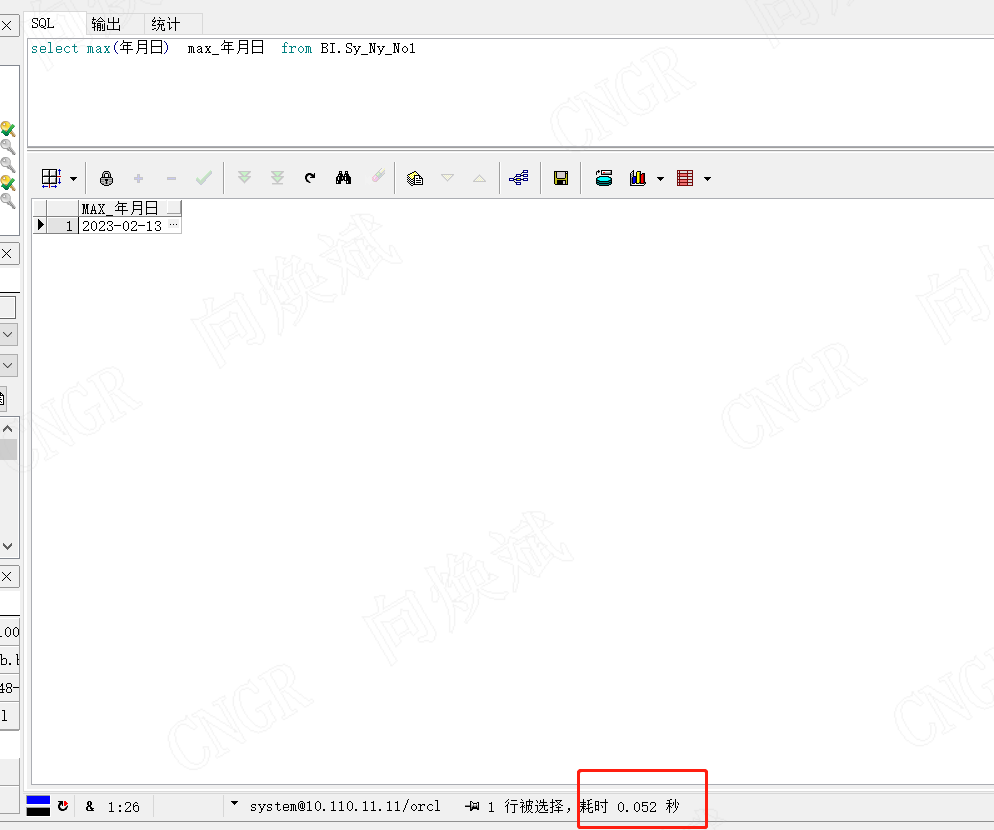 为了方便大家的理解,我在上面的13亿数据表中,增加了年月日的字段索引,看我们查找出最大的年月日需要多少耗时,对应增加索引的语句为,create index seq_name on table (column_name)。如增加BI.SY_NY_NO1表索引语句为create index seq_SY_NY_NO1 on BI.SY_NY_NO1(年月日)。