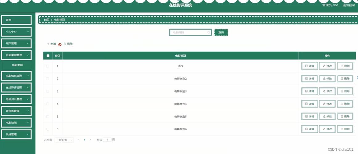 电影类别管理,在电影类别管理页面可以对索引、电影类别进行修改、删除或新增等操作,如图5-9所示。