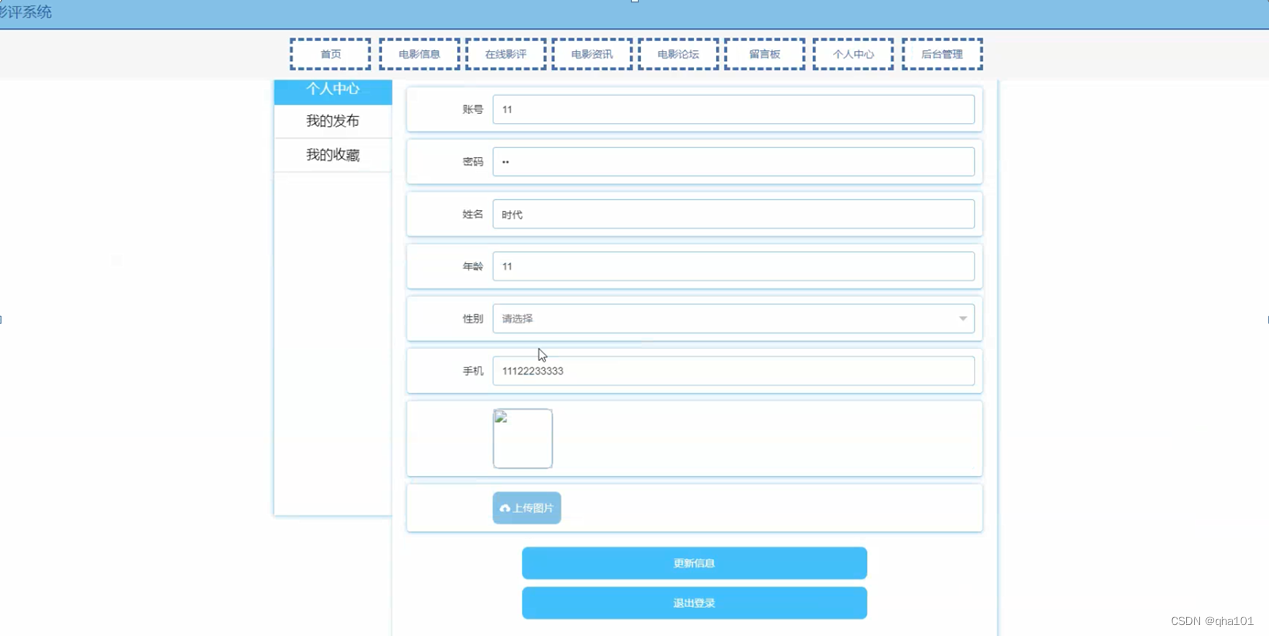个人中心,在个人中心页面,通过填写账号、密码、姓名、年龄、性别、手机、上传图片等进行更新信息,还能对我的发布、我的收藏进行相应操作,如图5-2所示。