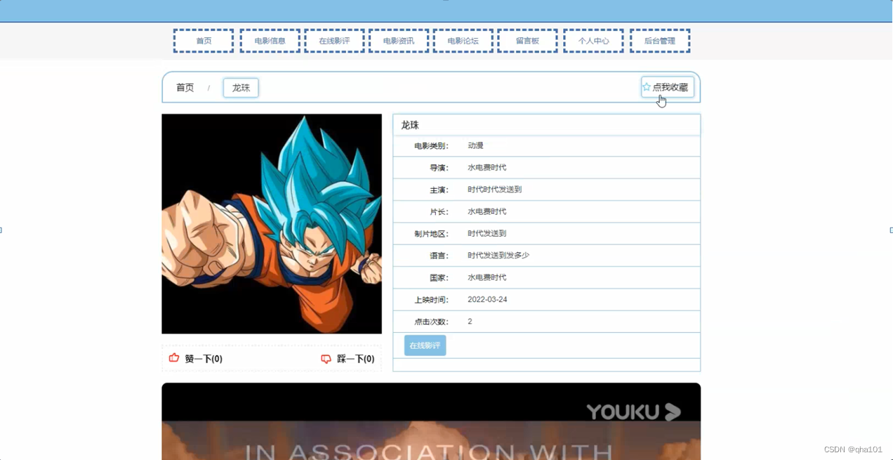 电影信息,在电影信息页面可以查看电影名称、电影类别、封面、导演、主演、片长、制片地区、语言、国家、上映时间、点击次数、视频、电影介绍等信息,并进行收藏、评论、赞、踩或在线影评等操作,如图5-3所示。