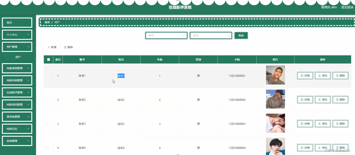 用户管理,在用户管理页面,可以对账号、姓名、年龄、性别、手机、照片等进行详情、修改、删除或新增等操作。如图5-8所示。