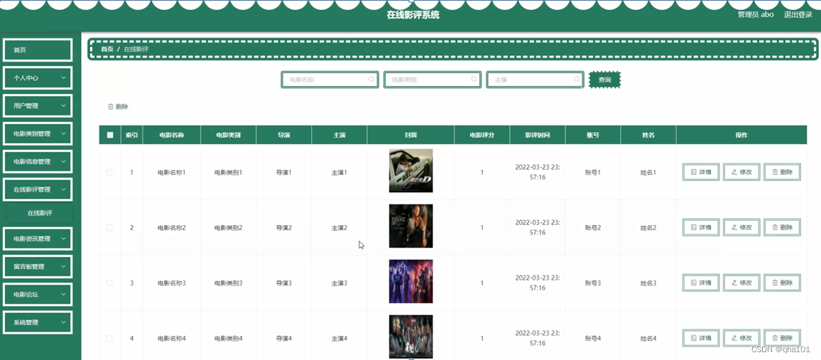 在线影评管理,在在线影评管理页面可以对索引、电影名称、电影类别、导演、主演、封面、电影评分、影评时间、账号、姓名等内容进行详情、修改、删除等操作,如图5-11所示。