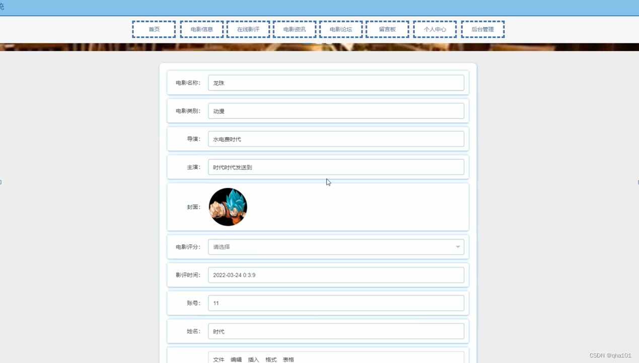 在电影信息页面,点击在线影评,通过输入电影名称、电影类别、导演、主演、封面、电影评分、影评时间、账号、姓名、详情等信息,点击提交进行在线影评,如图5-4所示。
