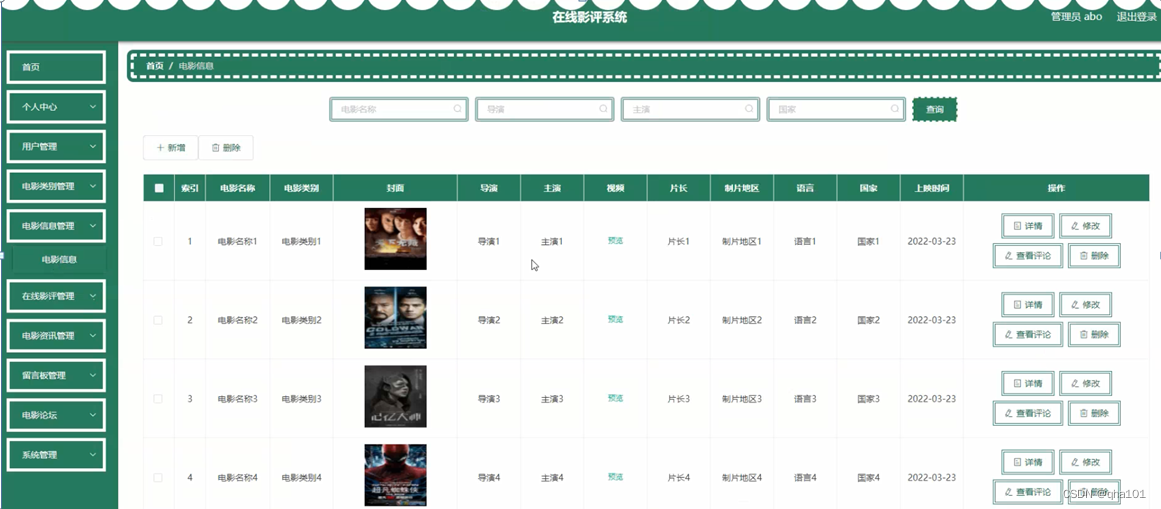 电影信息管理,在电影信息管理页面可以对索引、电影名称、电影类别、封面、导演、主演、视频、片长、制片地区、语言、国家、上映时间等内容进行查看、修改、删除或查看评论、新增等操作,如图5-10所示。