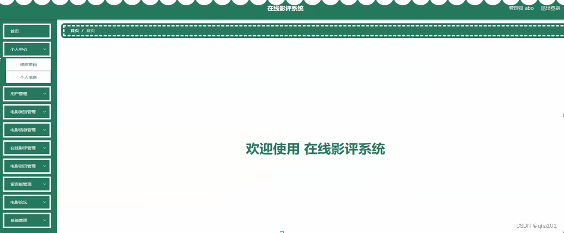 管理员登录系统后,可以对个人中心、用户管理、电影类别管理、电影信息管理、在线影评管理、电影资讯管理、留言板管理、电影论坛、系统管理等进行相应的操作管理,如图5-7所示。