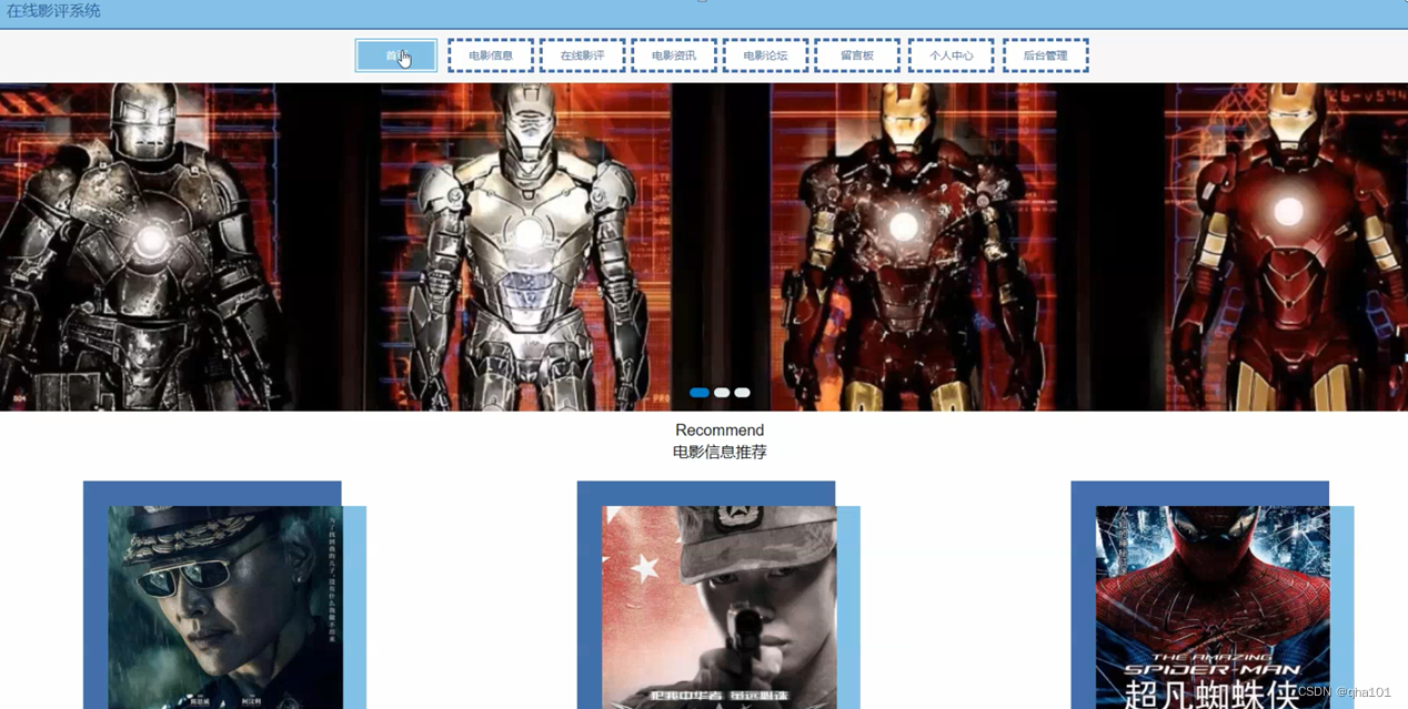 在在线影评系统的网站首页可以查看首页、电影信息、在线影评、电影资讯、电影论坛、留言板、个人中心、后台管理等内容,如图5-1所示。